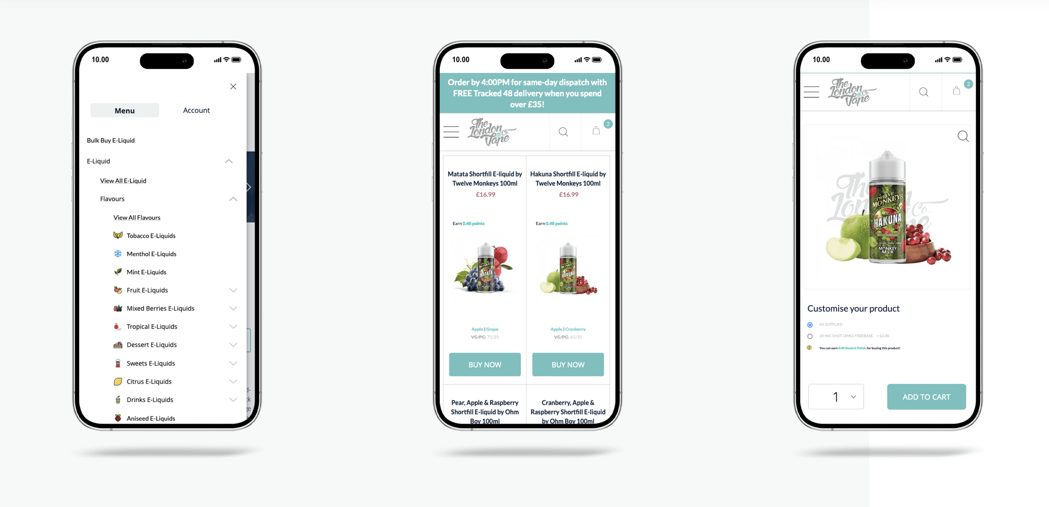 The London Vape Co. approached us with the goal of creating a modern and fully branded e commerce platform that could support their expanding product catalogue. They wanted a website that presents their products clearly while offering a smooth and engaging browsing experience. The brand identity needed to be strengthened through improved visuals, consistent styling and a more professional presentation across all digital touchpoints.