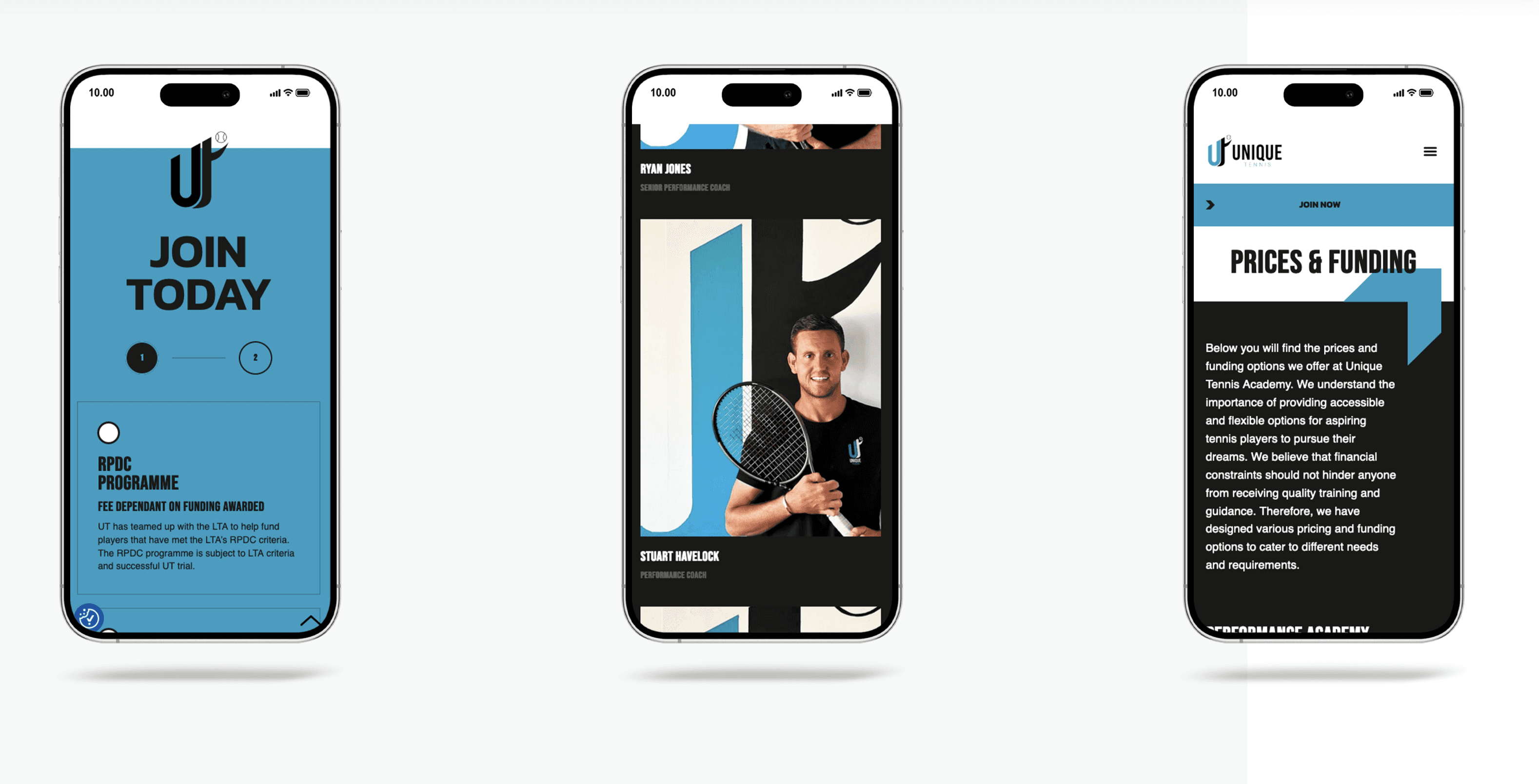 We delivered a bespoke website that transforms the digital presence of Unique Tennis. The new identity and design reflect the academy’s professionalism and high performance standards, using clean layouts, structured content and strong visual direction. The academy’s story and values are clearly presented, helping visitors understand their training philosophy and commitment to excellence.